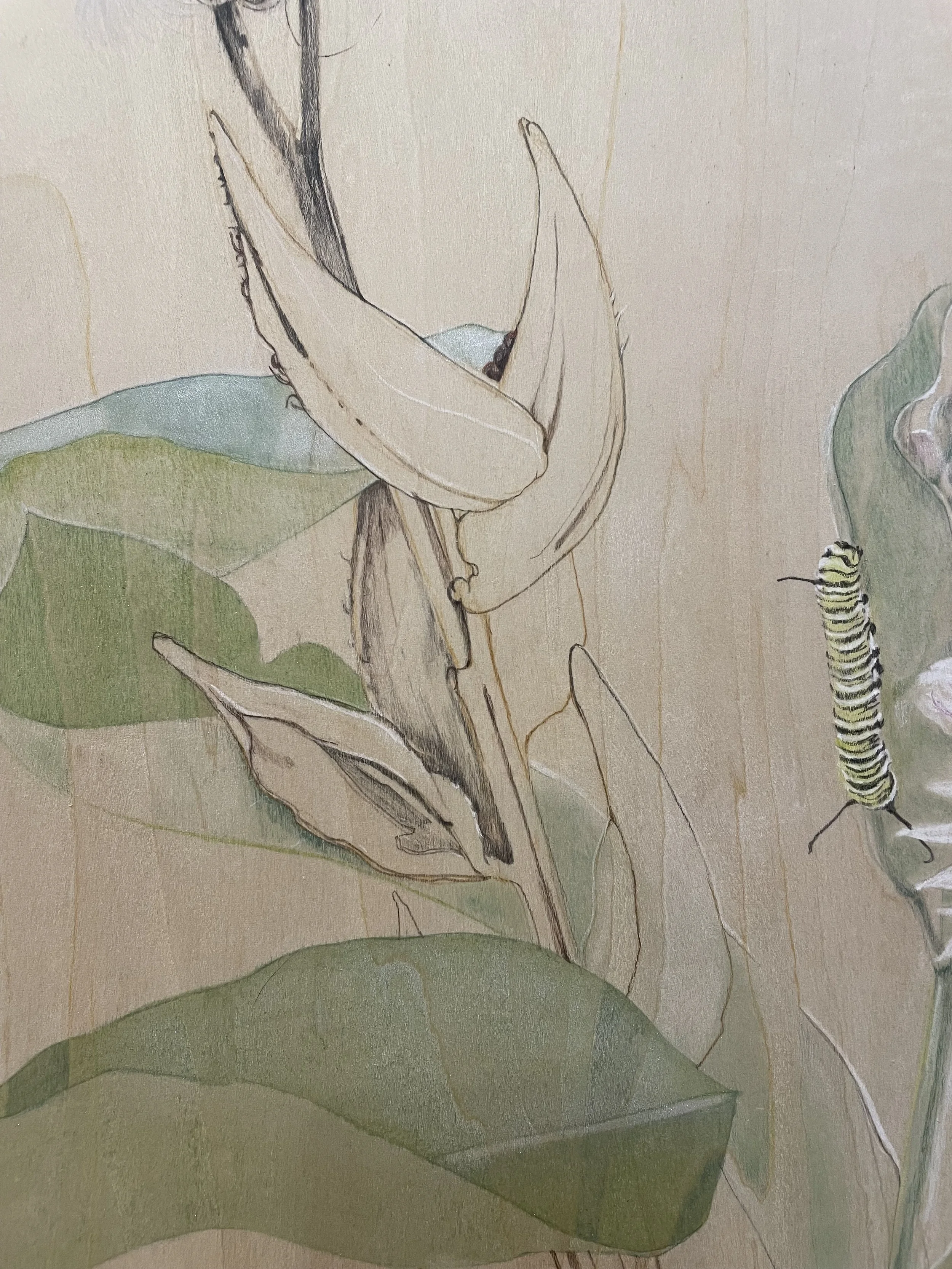 Milkweed for Monarchs, Drawing with Mixed Media and Collage (36”x36”x2”) with surrounding wall decals (42” x 96”)